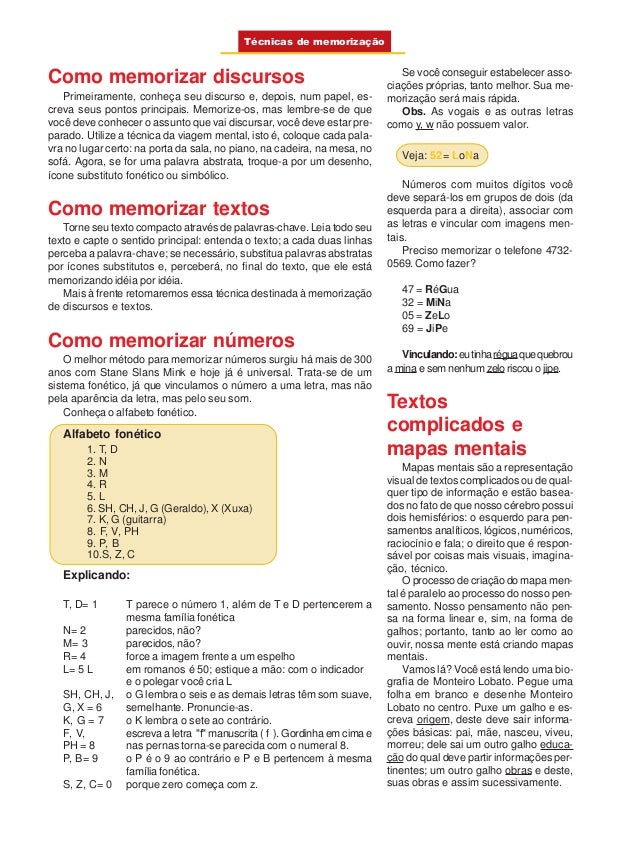 9. 9. Técnicas de memorização Como memorizar discursos Primeiramente, conheça seu discurso e, depois, num papel, es- creva seus pontos principais. Memorize-os, mas lembre-se de que você deve conhecer o assunto que vai discursar, você deve estar pre- parado. Utilize a técnica da viagem mental, isto é, coloque cada pala- vra no lugar certo: na porta da sala, no piano, na cadeira, na mesa, no sofá. Agora, se for uma palavra abstrata, troque-a por um desenho, ícone substituto fonético ou simbólico. Como memorizar textos Torne seu texto compacto através de palavras-chave. Leia todo seu texto e capte o sentido principal: entenda o texto; a cada duas linhas perceba a palavra-chave; se necessário, substitua palavras abstratas por ícones substitutos e, perceberá, no final do texto, que ele está memorizando idéia por idéia. Mais à frente retomaremos essa técnica destinada à memorização de discursos e textos. Como memorizar números O melhor método para memorizar números surgiu há mais de 300 anos com Stane Slans Mink e hoje já é universal. Trata-se de um sistema fonético, já que vinculamos o número a uma letra, mas não pela aparência da letra, mas pelo seu som. Conheça o alfabeto fonético. Alfabeto fonético 1. T, D 2. N 3. M 4. R 5. L 6. SH, CH, J, G (Geraldo), X (Xuxa) 7. K, G (guitarra) 8. F, V, PH 9. P, B 10.S, Z, C Explicando: T, D= 1 T parece o número 1, além de T e D pertencerem a mesma família fonética N= 2 parecidos, não? M= 3 parecidos, não? R= 4 force a imagem frente a um espelho L= 5 L em romanos é 50; estique a mão: com o indicador e o polegar você cria L SH, CH, J, o G lembra o seis e as demais letras têm som suave, G, X = 6 semelhante. Pronuncie-as. K, G = 7 o K lembra o sete ao contrário. F, V, escreva a letra "f" manuscrita ( f ). Gordinha em cima e PH = 8 nas pernas torna-se parecida com o numeral 8. P, B= 9 o P é o 9 ao contrário e P e B pertencem à mesma família fonética. S, Z, C= 0 porque zero começa com z. Se você conseguir estabelecer asso- ciações próprias, tanto melhor. Sua me- morização será mais rápida. Obs. As vogais e as outras letras como y, w não possuem valor. Veja: 52= LoNa Números com muitos dígitos você deve separá-los em grupos de dois (da esquerda para a direita), associar com as letras e vincular com imagens men- tais. Preciso memorizar o telefone 4732- 0569. Como fazer? 47 = RéGua 32 = MiNa 05 = ZeLo 69 = JiPe Vinculando:eutinharéguaquequebrou a mina e sem nenhum zelo riscou o jipe. Textos complicados e mapas mentais Mapas mentais são a representação visual de textos complicados ou de qual- quer tipo de informação e estão basea- dos no fato de que nosso cérebro possui dois hemisférios: o esquerdo para pen- samentos analíticos, lógicos, numéricos, raciocínio e fala; o direito que é respon- sável por coisas mais visuais, imagina- ção, técnico. O processo de criação do mapa men- tal é paralelo ao processo do nosso pen- samento. Nosso pensamento não pen- sa na forma linear e, sim, na forma de galhos; portanto, tanto ao ler como ao ouvir, nossa mente está criando mapas mentais. Vamos lá? Você está lendo uma bio- grafia de Monteiro Lobato. Pegue uma folha em branco e desenhe Monteiro Lobato no centro. Puxe um galho e es- creva origem, deste deve sair informa- ções básicas: pai, mãe, nasceu, viveu, morreu; dele sai um outro galho educa- ção do qual deve partir informações per- tinentes; um outro galho obras e deste, suas obras e assim sucessivamente.