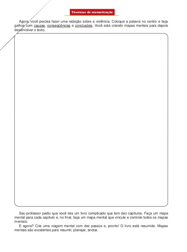 11. 11. Técnicas de memorização Agora, você precisa fazer uma redação sobre a violência. Coloque a palavra no centro e faça galhos com causas, conseqüências e conclusões. Você está criando mapas mentais para depois desenvolver o texto. Seu professor pediu que você leia um livro complicado que tem dez capítulos. Faça um mapa mental para cada capítulo e, no final, faça um mapa mental que vincule e controle todos os mapas mentais. E agora? Crie uma viagem mental com dez passos e, pronto! O livro está resumido. Mapas mentais são excelentes para resumir, planejar, anotar.