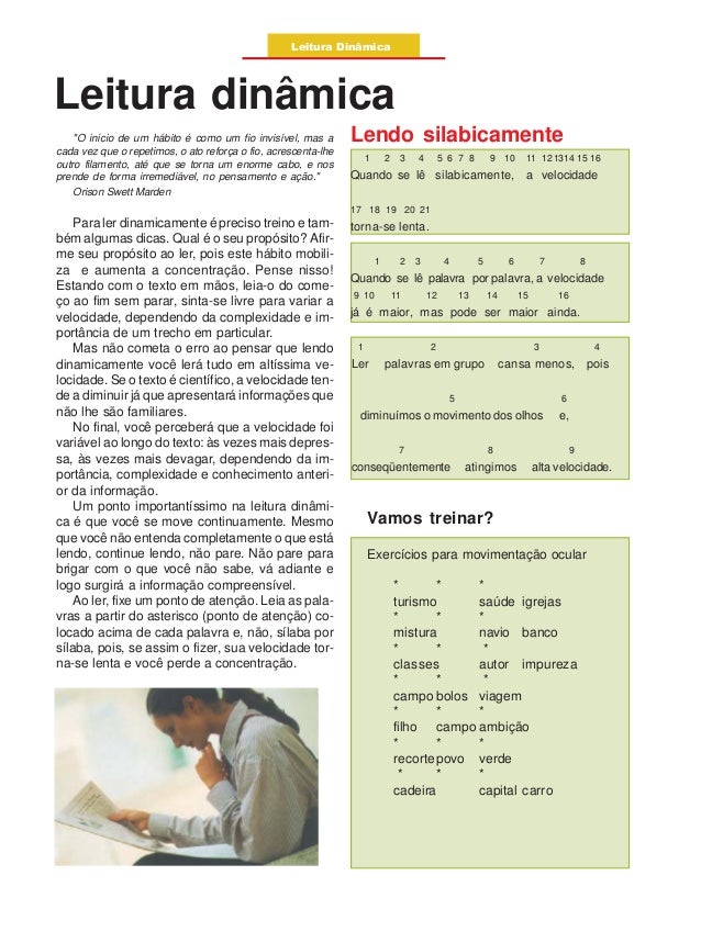 1. 1. Leitura Dinâmica Leitura dinâmica "O início de um hábito é como um fio invisível, mas a cada vez que o repetimos, o ato reforça o fio, acrescenta-lhe outro filamento, até que se torna um enorme cabo, e nos prende de forma irremediável, no pensamento e ação." Orison Swett Marden Para ler dinamicamente é preciso treino e tam- bém algumas dicas. Qual é o seu propósito? Afir- me seu propósito ao ler, pois este hábito mobili- za e aumenta a concentração. Pense nisso! Estando com o texto em mãos, leia-o do come- ço ao fim sem parar, sinta-se livre para variar a velocidade, dependendo da complexidade e im- portância de um trecho em particular. Mas não cometa o erro ao pensar que lendo dinamicamente você lerá tudo em altíssima ve- locidade. Se o texto é científico, a velocidade ten- de a diminuir já que apresentará informações que não lhe são familiares. No final, você perceberá que a velocidade foi variável ao longo do texto: às vezes mais depres- sa, às vezes mais devagar, dependendo da im- portância, complexidade e conhecimento anteri- or da informação. Um ponto importantíssimo na leitura dinâmi- ca é que você se move continuamente. Mesmo que você não entenda completamente o que está lendo, continue lendo, não pare. Não pare para brigar com o que você não sabe, vá adiante e logo surgirá a informação compreensível. Ao ler, fixe um ponto de atenção. Leia as pala- vras a partir do asterisco (ponto de atenção) co- locado acima de cada palavra e, não, sílaba por sílaba, pois, se assim o fizer, sua velocidade tor- na-se lenta e você perde a concentração. Lendo silabicamente 1 2 3 4 5 6 7 8 9 10 11 121314 15 16 Quando se lê silabicamente, a velocidade 17 18 19 20 21 torna-se lenta. 1 2 3 4 5 6 7 8 Quando se lê palavra por palavra, a velocidade 9 10 11 12 13 14 15 16 já é maior, mas pode ser maior ainda. 1 2 3 4 Ler palavras em grupo cansa menos, pois 5 6 diminuímos o movimento dos olhos e, 7 8 9 conseqüentemente atingimos alta velocidade. Vamos treinar? Exercícios para movimentação ocular * * * turismo saúde igrejas * * * mistura navio banco * * * classes autor impureza * * * campo bolos viagem * * * filho campo ambição * * * recortepovo verde * * * cadeira capital carro