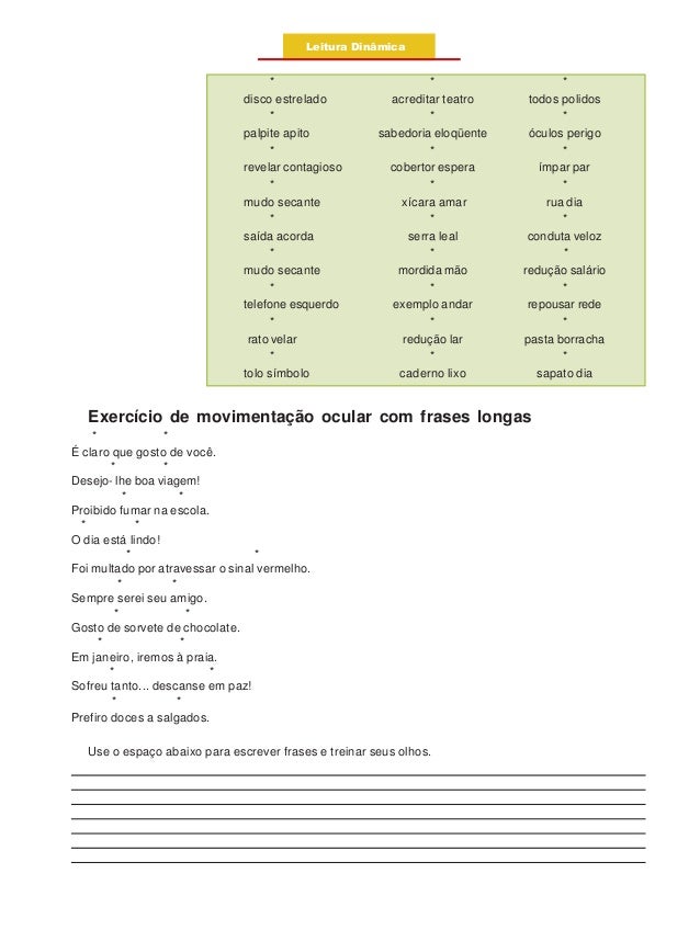 2. 2. Leitura Dinâmica * * * disco estrelado acreditar teatro todos polidos * * * palpite apito sabedoria eloqüente óculos perigo * * * revelar contagioso cobertor espera ímpar par * * * mudo secante xícara amar rua dia * * * saída acorda serra leal conduta veloz * * * mudo secante mordida mão redução salário * * * telefone esquerdo exemplo andar repousar rede * * * rato velar redução lar pasta borracha * * * tolo símbolo caderno lixo sapato dia Exercício de movimentação ocular com frases longas * * É claro que gosto de você. * * Desejo- lhe boa viagem! * * Proibido fumar na escola. * * O dia está lindo! * * Foi multado por atravessar o sinal vermelho. * * Sempre serei seu amigo. * * Gosto de sorvete de chocolate. * * Em janeiro, iremos à praia. * * Sofreu tanto... descanse em paz! * * Prefiro doces a salgados. Use o espaço abaixo para escrever frases e treinar seus olhos.