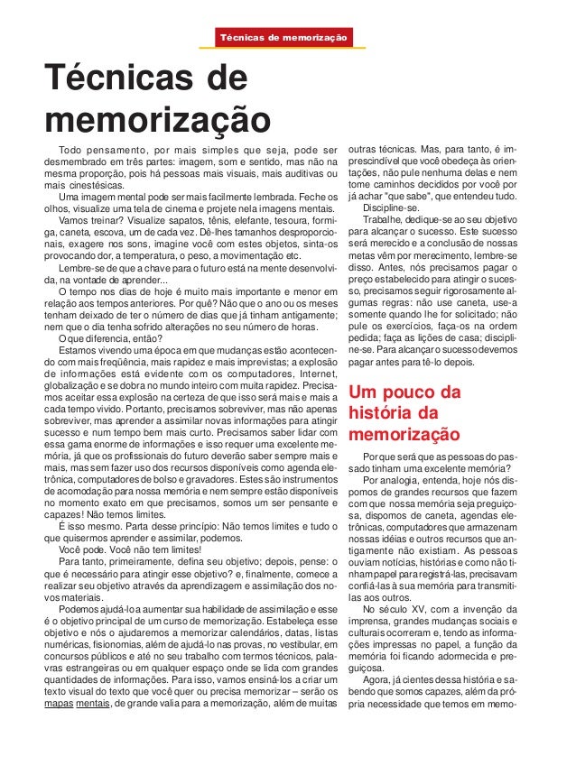 3. 3. Técnicas de memorização Técnicas de memorização Todo pensamento, por mais simples que seja, pode ser desmembrado em três partes: imagem, som e sentido, mas não na mesma proporção, pois há pessoas mais visuais, mais auditivas ou mais cinestésicas. Uma imagem mental pode ser mais facilmente lembrada. Feche os olhos, visualize uma tela de cinema e projete nela imagens mentais. Vamos treinar? Visualize sapatos, tênis, elefante, tesoura, formi- ga, caneta, escova, um de cada vez. Dê-lhes tamanhos desproporcio- nais, exagere nos sons, imagine você com estes objetos, sinta-os provocando dor, a temperatura, o peso, a movimentação etc. Lembre-se de que a chave para o futuro está na mente desenvolvi- da, na vontade de aprender... O tempo nos dias de hoje é muito mais importante e menor em relação aos tempos anteriores. Por quê? Não que o ano ou os meses tenham deixado de ter o número de dias que já tinham antigamente; nem que o dia tenha sofrido alterações no seu número de horas. O que diferencia, então? Estamos vivendo uma época em que mudanças estão acontecen- do com mais freqüência, mais rapidez e mais imprevistas; a explosão de informações está evidente com os computadores, Internet, globalização e se dobra no mundo inteiro com muita rapidez. Precisa- mos aceitar essa explosão na certeza de que isso será mais e mais a cada tempo vivido. Portanto, precisamos sobreviver, mas não apenas sobreviver, mas aprender a assimilar novas informações para atingir sucesso e num tempo bem mais curto. Precisamos saber lidar com essa gama enorme de informações e isso requer uma excelente me- mória, já que os profissionais do futuro deverão saber sempre mais e mais, mas sem fazer uso dos recursos disponíveis como agenda ele- trônica, computadores de bolso e gravadores. Estes são instrumentos de acomodação para nossa memória e nem sempre estão disponíveis no momento exato em que precisamos, somos um ser pensante e capazes! Não temos limites. É isso mesmo. Parta desse princípio: Não temos limites e tudo o que quisermos aprender e assimilar, podemos. Você pode. Você não tem limites! Para tanto, primeiramente, defina seu objetivo; depois, pense: o que é necessário para atingir esse objetivo? e, finalmente, comece a realizar seu objetivo através da aprendizagem e assimilação dos no- vos materiais. Podemos ajudá-lo a aumentar sua habilidade de assimilação e esse é o objetivo principal de um curso de memorização. Estabeleça esse objetivo e nós o ajudaremos a memorizar calendários, datas, listas numéricas, fisionomias, além de ajudá-lo nas provas, no vestibular, em concursos públicos e até no seu trabalho com termos técnicos, pala- vras estrangeiras ou em qualquer espaço onde se lida com grandes quantidades de informações. Para isso, vamos ensiná-los a criar um texto visual do texto que você quer ou precisa memorizar – serão os mapas mentais, de grande valia para a memorização, além de muitas outras técnicas. Mas, para tanto, é im- prescindível que você obedeça às orien- tações, não pule nenhuma delas e nem tome caminhos decididos por você por já achar "que sabe", que entendeu tudo. Discipline-se. Trabalhe, dedique-se ao seu objetivo para alcançar o sucesso. Este sucesso será merecido e a conclusão de nossas metas vêm por merecimento, lembre-se disso. Antes, nós precisamos pagar o preço estabelecido para atingir o suces- so, precisamos seguir rigorosamente al- gumas regras: não use caneta, use-a somente quando lhe for solicitado; não pule os exercícios, faça-os na ordem pedida; faça as lições de casa; discipli- ne-se. Para alcançar o sucesso devemos pagar antes para tê-lo depois. Um pouco da história da memorização Por que será que as pessoas do pas- sado tinham uma excelente memória? Por analogia, entenda, hoje nós dis- pomos de grandes recursos que fazem com que nossa memória seja preguiço- sa, dispomos de caneta, agendas ele- trônicas, computadores que armazenam nossas idéias e outros recursos que an- tigamente não existiam. As pessoas ouviam notícias, histórias e como não ti- nham papel para registrá-las, precisavam confiá-las à sua memória para transmiti- las aos outros. No século XV, com a invenção da imprensa, grandes mudanças sociais e culturais ocorreram e, tendo as informa- ções impressas no papel, a função da memória foi ficando adormecida e pre- guiçosa. Agora, já cientes dessa história e sa- bendo que somos capazes, além da pró- pria necessidade que temos em memo-
