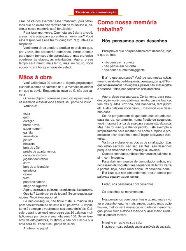 4. 4. Técnicas de memorização rizar, basta-nos exercitar esse "músculo", pois sabe- mos que só exercícios fortalecem os músculos e, as- sim, a nossa memória será fortalecida. Para isso, motive-se. Que nota você daria a você, à sua motivação para aprender a memorizar? Você está disponível a aceitar mudanças? Pergunte-se e responda. Você será direcionado a praticar exercícios que, por vezes, lhe parecerão estranhos, lentos demais para quem tem sede de aprendizado, mas é preciso obedecer às etapas, às orientações. Agora, o seu tempo será maior, mais lento, mas, no futuro, você economizará horas e horas de estudo. Mãos à obra Você vai ler/ouvir 20 palavras e, depois, pegue papel e caneta e anote as palavras da sua memória na ordem em que as ouviu. Enquanto as ouve ou lê, não use ca- neta. O nosso objetivo com esse exercício é posicioná-lo na memória e assim você saberá seu ponto de início. Vamos lá! mala gato coração barco a vela super-homem garrafa arroz-doce pirulito bicicleta bola de vôlei prédio de apartamentos caixa de fósforos jogador de futebol carro bolo de aniversário geladeira cavalo trem papel de parede maço de cigarros Agora,escrevaaspalavrasnaordemqueleuououviu. Que tal? Lembrou- se de todas? Se conseguiu, pa- rabéns! Você é excepcional. Se não conseguiu, não fique triste. A maioria das pessoas lembram-se de sete a 12 palavras. O impor- tante é começar e você saber seu ponto de início. Cal- cule-o assim: se você lembrou-se das 20 palavras mul- tiplique-as por cinco e sua nota será 100. Se se lem- brou de oito palavras, multiplique oito por cinco e sua nota será 40. Esse é seu ponto de início. Anote-o no papel. Como nossa memória trabalha? Nós pensamos com desenhos Para provar que nós pensamos com desenho, faça o que eu falo: • não pense em sorvete • não pense em bicicleta • não pense numa roda gigante E aí, o que aconteceu? Você pensou nestas coisas mesmosendo-lhepedidoquenãopensasse,porquê?Por- quenossamemórianãoregistraapalavranão,masregistra o desenho. Então, nós pensamos com desenhos. Agora, descreva sua casa. Certamente, para essa descrição você usou palavras: minha casa é branca, tem três quartos, cozinha, dois banheiros, tem jardim etc. Estas palavras você não viu, mas você viu o dese- nho casa. Se lhe perguntarem de que lado está situada sua casa na rua, certamente, numa fração de segundos, você imaginará a rua de sua casa e a posição da casa. Mas não foi isso que lhe foi pedido. Este exemplo é simplesmente para mostrar-lhe como é rápido o pro- cesso de criar desenho e trocá-lo por palavras e vice- versa. Vá à rua e observe as placas de sinalização. Elas não estão escritas, não são escritas, são desenhos porque os desenhos são uma língua universal. Quando sonhamos, não sonhamos com palavras e, sim, com imagens. Para abrir um arquivo de computador antigo, era necessário datilografar uma seqüência de letras, barra e pontos; hoje, basta clicar sobre um desenho-ícone. E é isso que nós pretendemos: trocar ícones por palavras e palavras por ícones. Então, nós pensamos com desenhos. Os desenhos se movimentam. Nós pensamos com desenhos e quanto mais vivo for o desenho, quanto mais amplo, quanto mais ação houver, melhor será nossa capacidade de memoriza- ção, pois o fluxo elétrico é maior e quanto maior, ajuda- nos a lembrar melhor. Imagine um gato na sua sala. Imagineumgatopulandosobreosmóveisdesuasala.