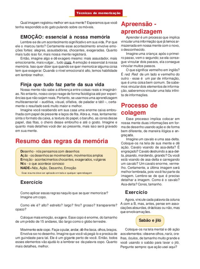 5. 5. Técnicas de memorização Qual imagem registrou melhor em sua mente? Esperamos que você tenha respondido a do gato pulando sobre os móveis. EMOÇÃO: essencial à nossa memória Lembre-se de um acontecimento significativo em sua vida. Por que ele o marcou tanto? Certamente esse acontecimento envolve emo- ções fortes: alegres, assustadoras, chocantes, exageradas. Quanto mais tudo isso for, mais nossa mente registrará. Então, imagine algo e dê exagero mesmo: mais assustador, mais emocionante, mais vulgar... tudo mais. A emoção é essencial à nossa memória. Isso quer dizer que quando se quer memorizar alguma coisa tem que exagerar. Quando o nível emocional é alto, temos habilidade em lembrar melhor. Finja que tudo faz parte da sua vida Nossa mente não sabe a diferença entre coisas reais e imaginári- as. No entanto, nosso corpo reage de forma fisiológica até por experi- ências que não sejam reais. Portanto, se usarmos uma aprendizagem multissensorial – auditiva, visual, olfativa, de paladar e tátil –, certa- mente o resultado será muito maior e melhor. Imagine você recebendo em sua casa uma enorme caixa embru- lhada com papel de presente e laços de fita. Abra-a, mas, lentamente: sinta o formato da caixa, a textura do papel, o barulho, as cores desse papel, das fitas, o cheiro desse embrulho e até o gosto. Imagine e quanto mais detalhes você der ao presente, mais isso será gravado em sua mente. Resumo das regras da memória Desenho - nós pensamos com desenhos Ação - os desenhos se movimentam, movimentos amplos Emoção - acontecimentos chocantes, exagerados, vulgares Nós - o que acontece conosco NADE=Nós, Ação, Desenho, Emoção Esse resumo deve ser aplicado em toda e qualquer aprendizagem Exercício Como aplicar essas regras naquilo que se quer memorizar? Imagine um copo. Como ele é? alto? estreito? largo? fino? grosso? transparente? opaco? Coloque mais emoção, exagere. Esse copo é enorme, do tamanho de um prédio de 15 andares, tão largo como o globo terrestre. Movimenteestecopo.Faça-opular,andar,dê-lheboca,olhos,braços. Envolva-se no desenho. Imagine que você vá pegá-lo e precisa de um guindaste para tal. Ele é um gigante perto de você. Então, todos esses elementos vão ajudá-lo a lembrar-se da palavra copo. Quanto mais detalhes, melhor. Apreensão - aprendizagem Aprender é um processo que implica vincular uma informação que já temos ar- mazenada em nossa mente com o novo, o desconhecido. Imagine uma criança: após o primei- ro passo, vem o segundo; se ela conse- gue vincular dois passos, ela consegue vincular muitos passos. O que significa vermelho em inglês? É red. Red de um lado e vermelho do outro - esse é um par de informação, que é uma coisa bem comum. Se sabe- mos vincular dois elementos de informa- ção, saberemos vincular uma lista infini- ta de informações. Processo de colagem Esse processo implica colocar em nossa mente duas informações em for- ma de desenho usando ação e de forma bem diferente, de maneira ilógica e en- graçada. Imagine um cavalo e uma asa-delta. Coloque-os na tela de sua mente e dê ação. Cavalo voando de asa-delta? É engraçado? Cavalo destruindo a asa-del- ta, pisando, mordendo, girando? Ou você está voando de asa-delta e carregando um cavalo? Um cavalo enorme, verme- lho. Certamente, a última imagem será melhor lembrada, pois você fez parte da imagem. Lembre-se de que é preciso detalhar a imagem. Como é o cavalo? Asa-delta? Cores, tamanho. Exercício Agora, vincule cada palavra da coluna A com a B, mas, antes, pense em asso- ciações absurdas, drásticas ou não, mas que envolvam ações. Sabão e jiló Coloque-os na tela mental e dê ação aos elementos: observe olhos, nariz, ore- lhas, óculos, de tamanho muito grande e você usando o sabão para lavar o jiló. Pergunte sempre: que ação usei aqui?