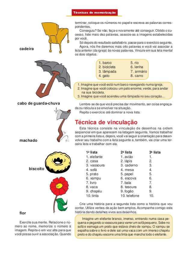 7. 7. Técnicas de memorização cadeira terminar, coloque os números no papel e escreva as palavras corres- pondentes. Conseguiu? Se não, faça-o novamente até conseguir. Obtido o su- cesso, liste mais dez palavras, associe-as a imagens estabelecidas por você. Só depois do resultado satisfatório, passe para o exercício seguinte. Agora, nós lhe daremos mais oito palavras e você vai associar a lista anterior (da igreja) às novas palavras. Vincule em sua tela mental os dois objetos. 1. barco 5. rio 2. bicicleta 6. lenha 3. lâmpada 7. armário 4. gato 8. carro 1. Imagine que você está num barco navegando numa igreja. 2. Imagine que você colocou um pato enorme, verde, para andar na sua bicicleta. 3. Imagine que você acendeu uma lâmpada no seu coração... Lembre-se de que você precisa dar movimento, ser coisa engraça- da ou ridícula e se envolver na situação. Repita o exercício até dominar a nova lista. Técnica de vinculação Esta técnica consiste na vinculação de desenhos na ordem seqüencial em que aparecem na listagem seguinte. Vamos trabalhar com a primeira lista e, depois, você vai seguir a orientação para desen- volver seu trabalho com a lista seguinte e, também, vai criar uma ter- ceira lista e trabalhar com ela. 1a lista 2a lista 3a lista 1. elefante 1. avião 1. 2. casa 2. lápis 2. 3. vassoura 3. caderno 3. 4. sofá 4. mesa 4. 5. prato 5. papel 5. 6. xampu 6. escova 6. 7. livro 7. bala 7. 8. vaca 8. tesoura 8. 9. chapéu 9. fogão 9. 10. tinta 10. telefone 10. Crie uma história para a segunda lista como a história que vou contar. Utilize verbos de ação bem amplos. Acompanhe comigo esta história dando detalhes vivos aos desenhos. Imagine um elefante branco, imenso, entrando numa casa pe- quena e pegando a vassoura para varrer um sofá pequeno. Sobe no sofá e esmaga um prato que estava cheio de xampu. O xampu se espalha sobre o livro e dele sai uma vaca com um imenso chapéu preto e do chapéu escorre uma tinta que mancha todo o elefante. cabo de guarda-chuva machado biscoito flor Exercite sua mente. Relacione o nú- mero ao nome, memorize o número à imagem. Repita-o em voz alta para que você possa ouvir a associação. Quando