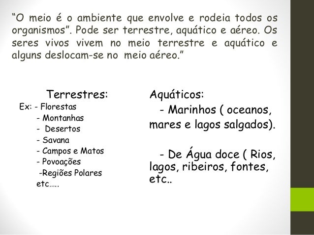 8. 8. “O meio é o ambiente que envolve e rodeia todos os organismos”. Pode ser terrestre, aquático e aéreo. Os seres vivos vivem no meio terrestre e aquático e alguns deslocam-se no meio aéreo.” Terrestres: Ex: - Florestas - Montanhas - Desertos - Savana - Campos e Matos - Povoações -Regiões Polares etc….. Aquáticos: - Marinhos ( oceanos, mares e lagos salgados). - De Água doce ( Rios, lagos, ribeiros, fontes, etc..