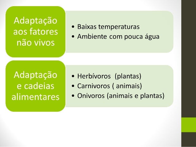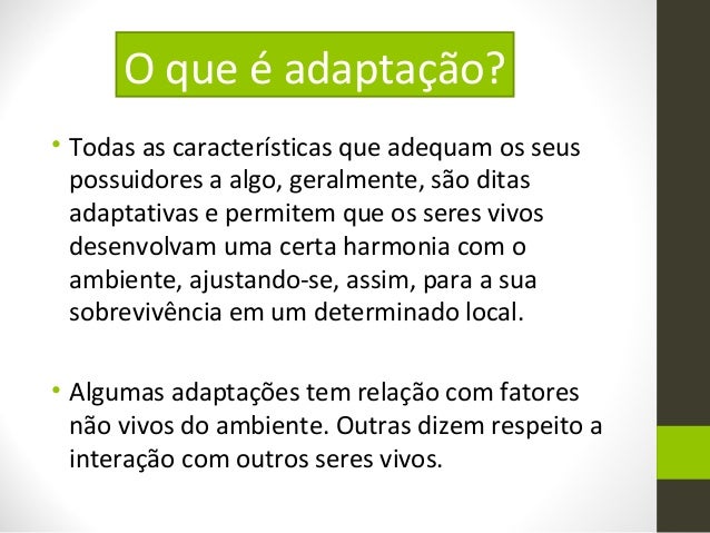 2. 2. • Todas as características que adequam os seus possuidores a algo, geralmente, são ditas adaptativas e permitem que os seres vivos desenvolvam uma certa harmonia com o ambiente, ajustando-se, assim, para a sua sobrevivência em um determinado local. • Algumas adaptações tem relação com fatores não vivos do ambiente. Outras dizem respeito a interação com outros seres vivos. O que é adaptação?