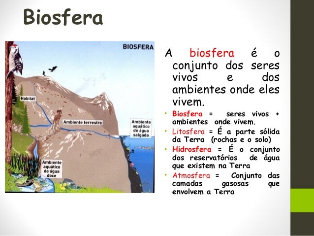 4. 4. Biosfera A biosfera é o conjunto dos seres vivos e dos ambientes onde eles vivem. • Biosfera = seres vivos + ambientes onde vivem. • Litosfera = É a parte sólida da Terra (rochas e o solo) • Hidrosfera = É o conjunto dos reservatórios de água que existem na Terra • Atmosfera = Conjunto das camadas gasosas que envolvem a Terra