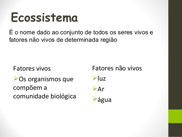 6. 6. Fatores vivos Os organismos que compõem a comunidade biológica Fatores não vivos luz Ar água Ecossistema É o nome dado ao conjunto de todos os seres vivos e fatores não vivos de determinada região