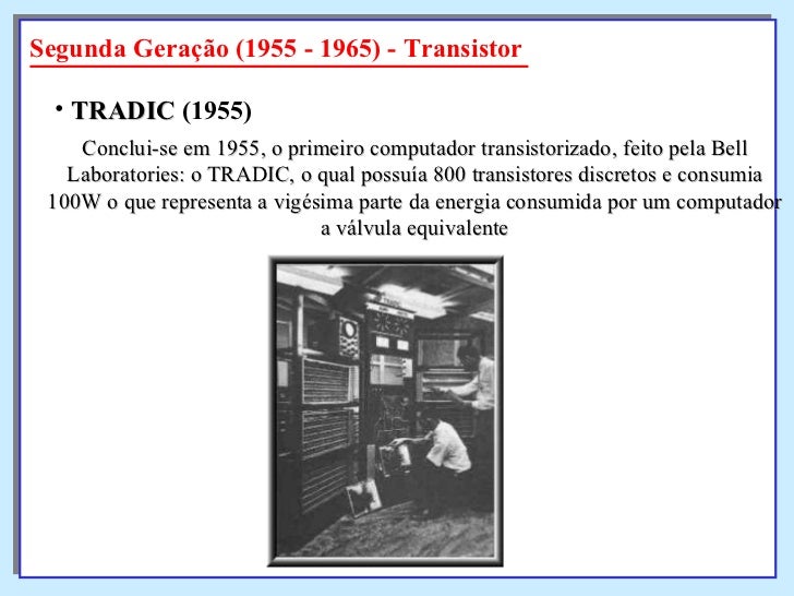 16. 16. Segunda Geração (1955 - 1965) - Transistor <ul><ul><li>Conclui-se em 1955, o primeiro computador transistorizado, feito pela Bell </li></ul></ul><ul><ul><li>Laboratories: o TRADIC, o qual possuía 800 transistores discretos e consumia </li></ul></ul><ul><ul><li>100W o que representa a vigésima parte da energia consumida por um computador </li></ul></ul><ul><ul><li>a válvula equivalente </li></ul></ul><ul><li>TRADIC (1955) </li></ul>