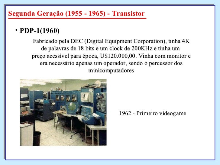 19. 19. Segunda Geração (1955 - 1965) - Transistor <ul><ul><li>Fabricado pela DEC (Digital Equipment Corporation), tinha 4K de palavras de 18 bits e um clock de 200KHz e tinha um </li></ul></ul><ul><ul><li>preço acessível para época, U$120.000,00. Vinha com monitor e era necessário apenas um operador, sendo o percussor dos </li></ul></ul><ul><ul><li>minicomputadores </li></ul></ul><ul><li>PDP-1 (1960) </li></ul>1962 - Primeiro videogame