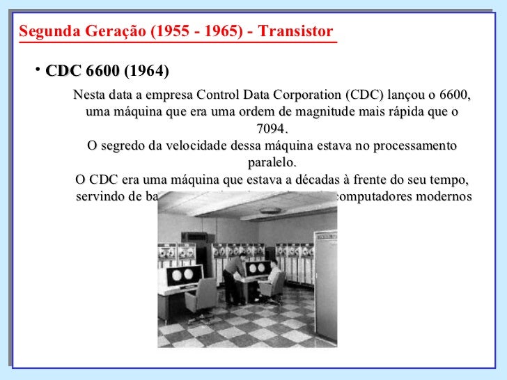 20. 20. Segunda Geração (1955 - 1965) - Transistor <ul><ul><li>Nesta data a empresa Control Data Corporation (CDC) lançou o 6600, </li></ul></ul><ul><ul><li>uma máquina que era uma ordem de magnitude mais rápida que o 7094. </li></ul></ul><ul><ul><li>O segredo da velocidade dessa máquina estava no processamento paralelo. </li></ul></ul><ul><ul><li>O CDC era uma máquina que estava a décadas à frente do seu tempo, </li></ul></ul><ul><ul><li>servindo de base para muitos dos projetos de computadores modernos </li></ul></ul><ul><li>CDC 6600 (1964) </li></ul>