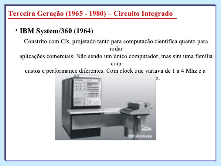 22. 22. <ul><ul><li>Constrito com CIs, projetado tanto para computação científica quanto para rodar </li></ul></ul><ul><ul><li>aplicações comerciais. Não sendo um único computador, mas sim uma família com </li></ul></ul><ul><ul><li>custos e performance diferentes. Com clock que variava de 1 a 4 Mhz e a </li></ul></ul><ul><ul><li>possibilidade de multiprogramação. </li></ul></ul><ul><li>IBM System/360 (1964) </li></ul>Terceira Geração (1965 - 1980) – Circuito Integrado