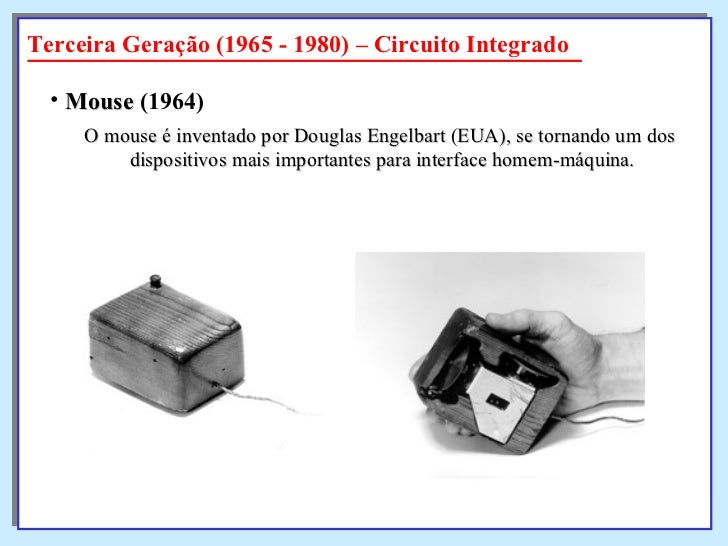 23. 23. <ul><ul><li>O mouse é inventado por Douglas Engelbart (EUA), se tornando um dos </li></ul></ul><ul><ul><li>dispositivos mais importantes para interface homem-máquina. </li></ul></ul><ul><li>Mouse (1964) </li></ul>Terceira Geração (1965 - 1980) – Circuito Integrado