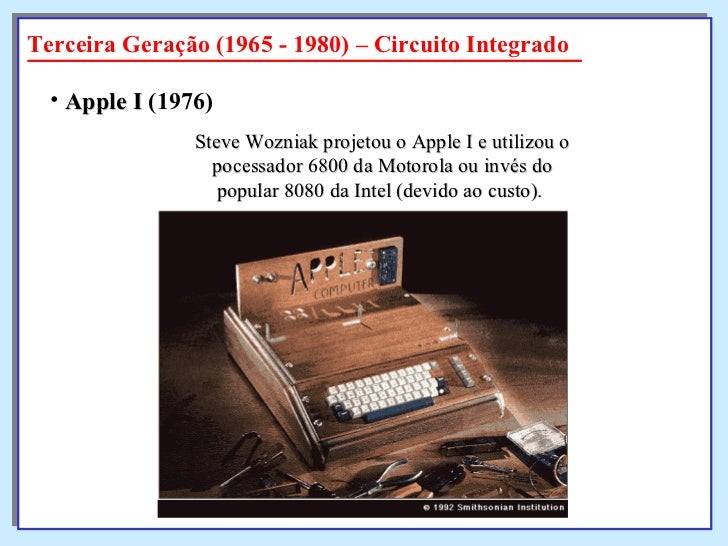 25. 25. <ul><ul><li>Steve Wozniak projetou o Apple I e utilizou o </li></ul></ul><ul><ul><li>pocessador 6800 da Motorola ou invés do </li></ul></ul><ul><ul><li>popular 8080 da Intel (devido ao custo). </li></ul></ul><ul><li>Apple I (1976) </li></ul>Terceira Geração (1965 - 1980) – Circuito Integrado
