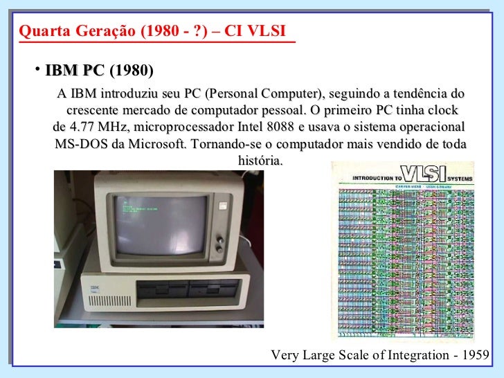 27. 27. <ul><ul><li>A IBM introduziu seu PC (Personal Computer), seguindo a tendência do </li></ul></ul><ul><ul><li>crescente mercado de computador pessoal. O primeiro PC tinha clock </li></ul></ul><ul><ul><li>de 4.77 MHz, microprocessador Intel 8088 e usava o sistema operacional </li></ul></ul><ul><ul><li>MS-DOS da Microsoft. Tornando-se o computador mais vendido de toda história. </li></ul></ul><ul><li>IBM PC (1980) </li></ul>Quarta Geração (1980 - ?) – CI VLSI Very Large Scale of Integration - 1959