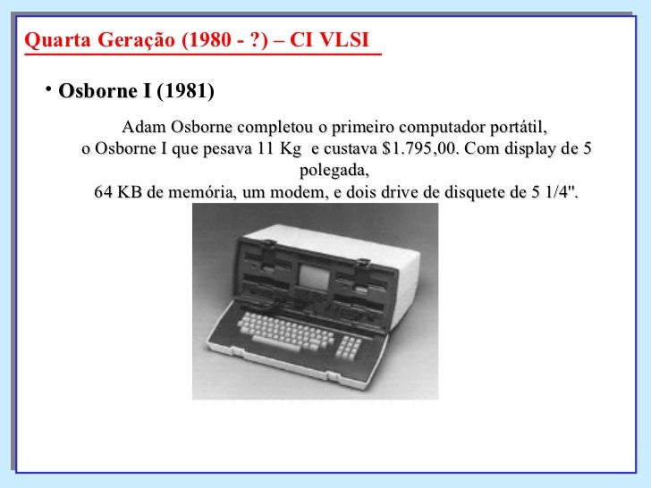 28. 28. <ul><ul><li>Adam Osborne completou o primeiro computador portátil, </li></ul></ul><ul><ul><li>o Osborne I que pesava 11 Kg e custava $1.795,00. Com display de 5 polegada, </li></ul></ul><ul><ul><li>64 KB de memória, um modem, e dois drive de disquete de 5 1/4''. </li></ul></ul><ul><li>Osborne I (1981) </li></ul>Quarta Geração (1980 - ?) – CI VLSI