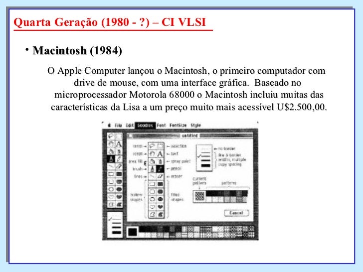 30. 30. <ul><ul><li>O Apple Computer lançou o Macintosh, o primeiro computador com </li></ul></ul><ul><ul><li>drive de mouse, com uma interface gráfica. Baseado no </li></ul></ul><ul><ul><li>microprocessador Motorola 68000 o Macintosh incluiu muitas das </li></ul></ul><ul><ul><li>características da Lisa a um preço muito mais acessível U$2.500,00. </li></ul></ul><ul><li>Macintosh (1984) </li></ul>Quarta Geração (1980 - ?) – CI VLSI