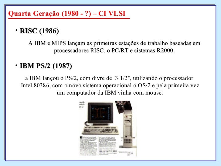 31. 31. <ul><ul><li>A IBM e MIPS lançam as primeiras estações de trabalho baseadas em processadores RISC, o PC/RT e sistemas R2000. </li></ul></ul><ul><li>RISC (1986) </li></ul>Quarta Geração (1980 - ?) – CI VLSI a IBM lançou o PS/2, com divre de 3 1/2'', utilizando o processador Intel 80386, com o novo sistema operacional o OS/2 e pela primeira vez um computador da IBM vinha com mouse. <ul><li>IBM PS/2 (1987) </li></ul>