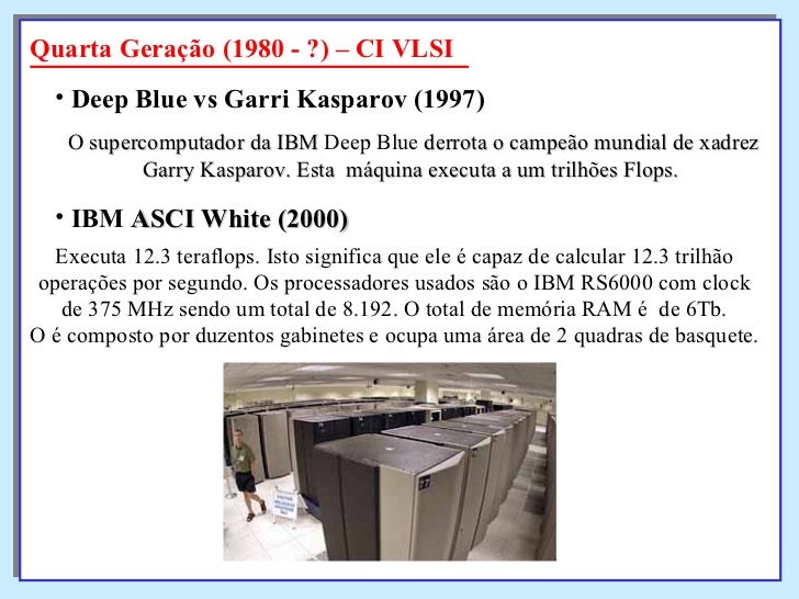 32. 32. <ul><ul><li>O supercomputador da IBM Deep Blue derrota o campeão mundial de xadrez Garry Kasparov. Esta máquina executa a um trilhões Flops. </li></ul></ul><ul><li>Deep Blue vs Garri Kasparov (1997) </li></ul>Quarta Geração (1980 - ?) – CI VLSI Executa 12.3 teraflops. Isto significa que ele é capaz de calcular 12.3 trilhão operações por segundo. Os processadores usados são o IBM RS6000 com clock de 375 MHz sendo um total de 8.192. O total de memória RAM é de 6Tb. O é composto por duzentos gabinetes e ocupa uma área de 2 quadras de basquete. <ul><li>IBM ASCI White (2000) </li></ul>