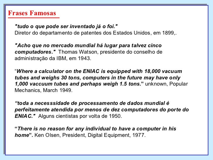33. 33. &quot;tudo o que pode ser inventado já o foi.&quot; Diretor do departamento de patentes dos Estados Unidos, em 1899,. &quot;Acho que no mercado mundial há lugar para talvez cinco computadores.&quot; Thomas Watson, presidente do conselho de administração da IBM, em 1943. “ Where a calculator on the ENIAC is equipped with 18,000 vacuum tubes and weighs 30 tons, computers in the future may have only 1,000 vaccuum tubes and perhaps weigh 1.5 tons .” unknown, Popular Mechanics, March 1949. “ toda a necesssidade de processamento de dados mundial é perfeitamente atendida por menos de dez computadores do porte do ENIAC.&quot; Alguns cientistas por volta de 1950. “ There is no reason for any individual to have a computer in his home ”. Ken Olsen, President, Digital Equipment, 1977. Frases Famosas