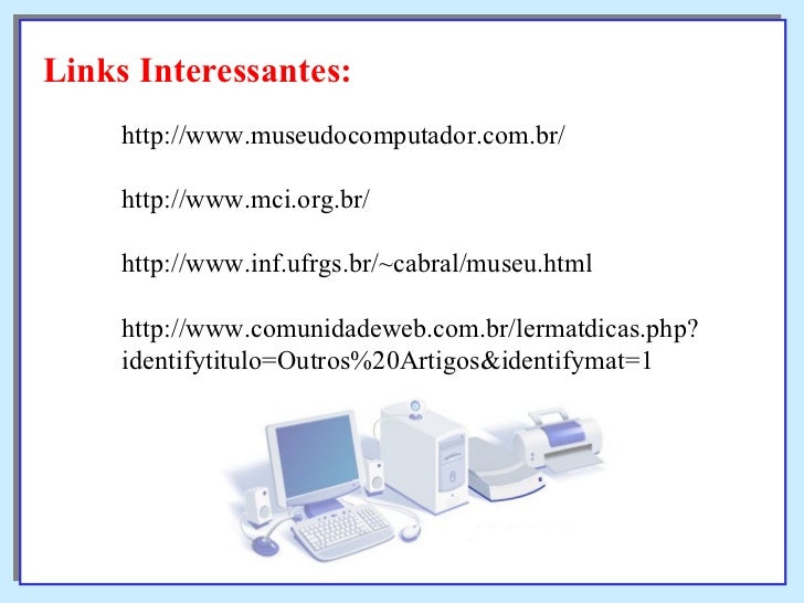 34. 34. Links Interessantes: http://www.museudocomputador.com.br/ http://www.mci.org.br/ http://www.inf.ufrgs.br/~cabral/museu.html http://www.comunidadeweb.com.br/lermatdicas.php? identifytitulo=Outros%20Artigos&identifymat=1