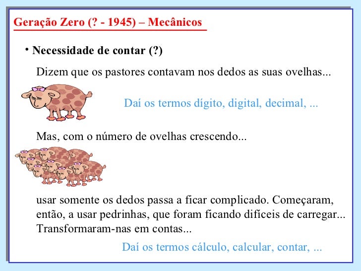 4. 4. Geração Zero (? - 1945) – Mecânicos <ul><li>Necessidade de contar (?) </li></ul>Dizem que os pastores contavam nos dedos as suas ovelhas... Daí os termos dígito, digital, decimal, ... Mas, com o número de ovelhas crescendo... usar somente os dedos passa a ficar complicado. Começaram, então, a usar pedrinhas, que foram ficando difíceis de carregar... Transformaram-nas em contas... Daí os termos cálculo, calcular, contar, ...
