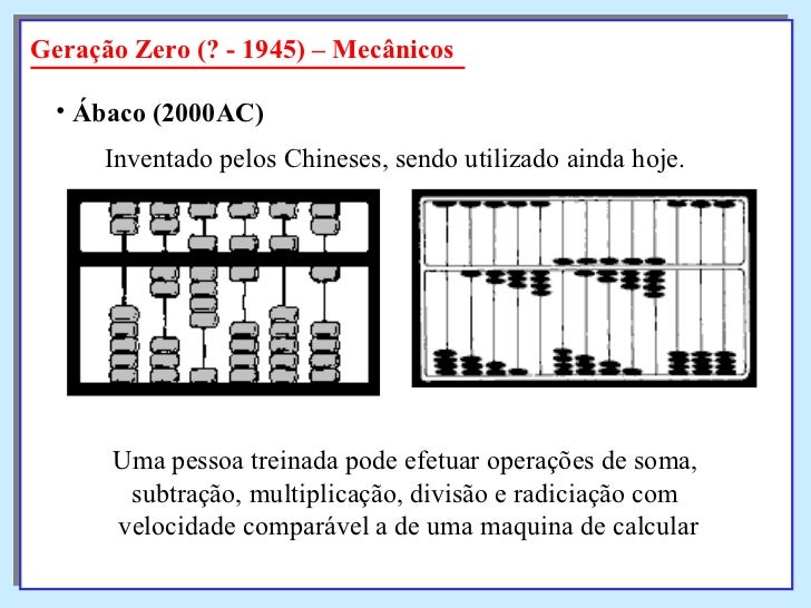 5. 5. Geração Zero (? - 1945) – Mecânicos <ul><li>Ábaco (2000AC) </li></ul>Inventado pelos Chineses, sendo utilizado ainda hoje. Uma pessoa treinada pode efetuar operações de soma, subtração, multiplicação, divisão e radiciação com velocidade comparável a de uma maquina de calcular