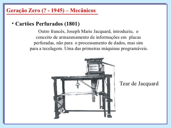 8. 8. Geração Zero (? - 1945) – Mecânicos <ul><li>Cartões Perfurados (1801) </li></ul>Outro francês, Joseph Marie Jacquard, introduziu, o conceito de armazenamento de informações em placas perfuradas, não para o processamento de dados, mas sim para a tecelagem. Uma das primeiras máquinas programáveis. Tear de Jacquard