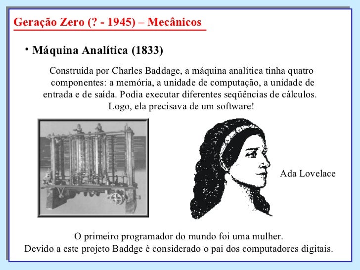 9. 9. Geração Zero (? - 1945) – Mecânicos <ul><li>Máquina Analítica (1833) </li></ul>Construída por Charles Baddage, a máquina analítica tinha quatro componentes: a memória, a unidade de computação, a unidade de entrada e de saída. Podia executar diferentes seqüências de cálculos. Logo, ela precisava de um software! O primeiro programador do mundo foi uma mulher. Devido a este projeto Baddge é considerado o pai dos computadores digitais. Ada Lovelace