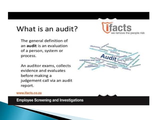 An audit was conducted to examine physical records, do an inventory analysis, and conduct a pantry audit. The distinguishing features of this observation method are that the data is collected personally by the researcher through counting physical objects. An audit involves the researcher directly examining records and inventory to collect count data.