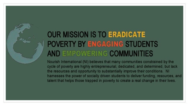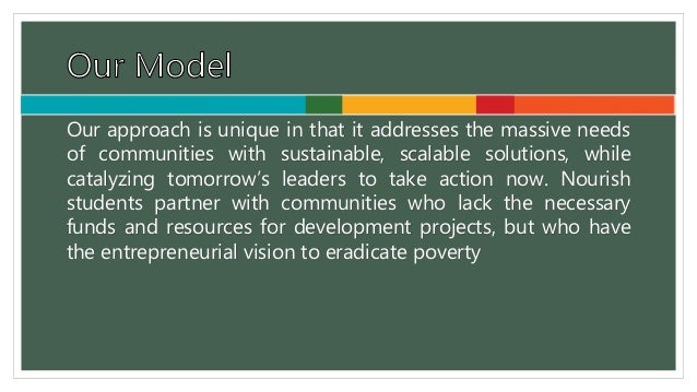 4. 4. • Our approach is unique in that it addresses the massive needs of communities with sustainable, scalable solutions, while catalyzing tomorrow’s leaders to take action now. Nourish students partner with communities who lack the necessary funds and resources for development projects, but who have the entrepreneurial vision to eradicate poverty.