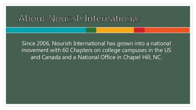 2. 2. Since 2006, Nourish International has grown into a national movement with 60 Chapters on college campuses in the US and Canada and a National Office in Chapel Hill, NC.