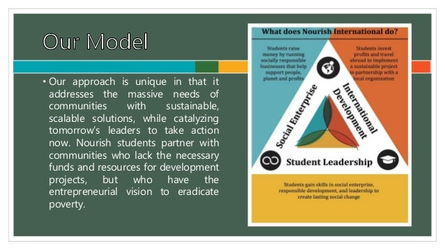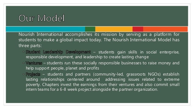 3. 3. Nourish International accomplishes its mission by serving as a platform for students to make a global impact today. The Nourish International Model has three parts: – students gain skills in social enterprise, responsible development, and leadership to create lasting change – students run these socially responsible businesses to raise money and help support people, planet and profits – students and partners (community-led, grassroots NGOs) establish lasting relationships centered around addressing issues related to extreme poverty. Chapters invest the earnings from their ventures and also commit small intern teams for a 6-8 week project alongside the partner organization.
