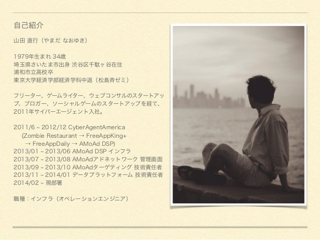 → FreeAppDaily → AMoAd DSP) 2013/01 2013/06 AMoAd DSP インフラ 2013/07 2013/08 AMoAdアドネットワーク 管理画面 2013/09 2013/10 AMoAdターゲティング 技術責任者 2013/11 2014/01 データプラットフォーム 技術責任者 2014/02 現部署 ! 職種:インフラ(オペレーションエンジニア) 自己紹介