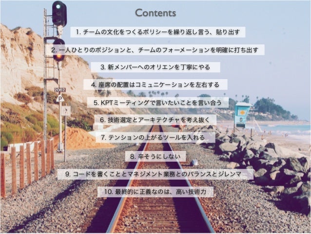 4. 4. Contents 1. チームの文化をつくるポリシーを繰り返し言う、貼り出す 2. 一人ひとりのポジションと、チームのフォーメーションを明確に打ち出す 3. 新メンバーへのオリエンを丁寧にやる 4. 座席の配置はコミュニケーションを左右する 5. KPTミーティングで言いたいことを言い合う 6. 技術選定とアーキテクチャを考え抜く 7. テンションの上がるツールを入れる 8. 辛そうにしない 9. コードを書くこととマネジメント業務とのバランスとジレンマ 10. 最終的に正義なのは、高い技術力