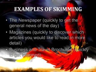 Skimming is used to quickly gather the most important information, or 'gist'. Run your eyes over the text, noting important information. Use skimming to quickly get up to speed on a current business situation. It's not essential to understand each word when skimming.