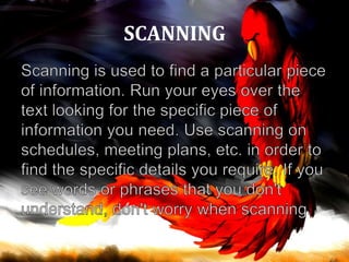 Scanning is used to find a particular piece of information. Run your eyes over the text looking for the specific piece of information you need. Use scanning on schedules, meeting plans, etc. in order to find the specific details you require. If you see words or phrases that you don't understand, don't worry when scanning.