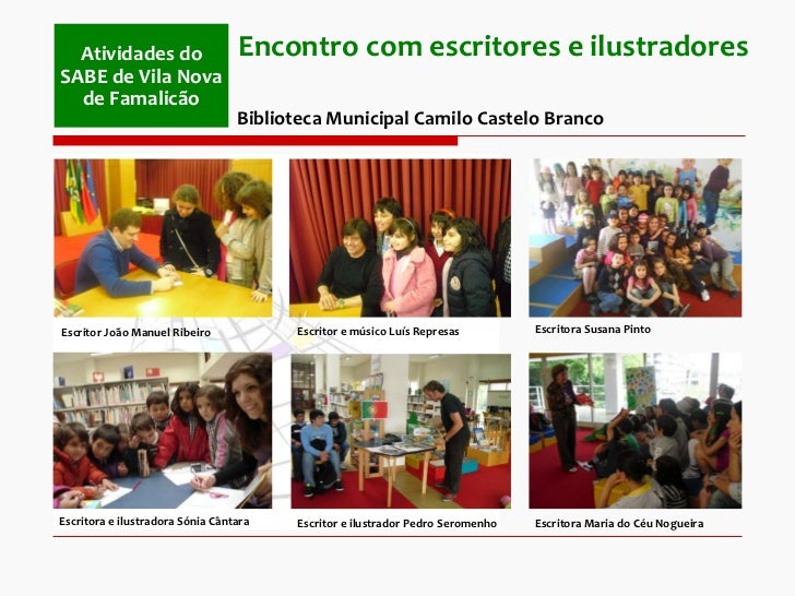 11. 11. <ul><li>Encontro com escritores e ilustradores </li></ul>Escritor João Manuel Ribeiro Escritora e ilustradora Sónia Cântara Escritor e músico Luís Represas Escritor e ilustrador Pedro Seromenho Biblioteca Municipal Camilo Castelo Branco Escritora Susana Pinto Escritora Maria do Céu Nogueira Atividades do SABE de Vila Nova de Famalicão