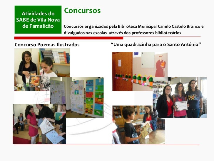 12. 12. Concursos <ul><li>Concurso Poemas Ilustrados </li></ul><ul><li>“ Uma quadrazinha para o Santo António” </li></ul>Concursos organizados pela Biblioteca Municipal Camilo Castelo Branco e divulgados nas escolas através dos professores bibliotecários Atividades do SABE de Vila Nova de Famalicão