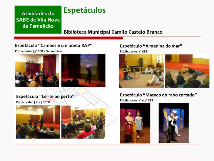 13. 13. Espetáculos <ul><li>Espetáculo “Camões é um poeta RAP” </li></ul><ul><li>Público-alvo | 3º CEB e Secundário </li></ul><ul><li>Espetáculo “Ler-te ao perto” </li></ul><ul><li>Público-alvo | 2º e 3º CEB </li></ul>Espetáculo “Macaco do rabo cortado” Público-alvo | 1º e 2º CEB Espetáculo “A menina do mar” Público-alvo | 1º CEB Biblioteca Municipal Camilo Castelo Branco Atividades do SABE de Vila Nova de Famalicão