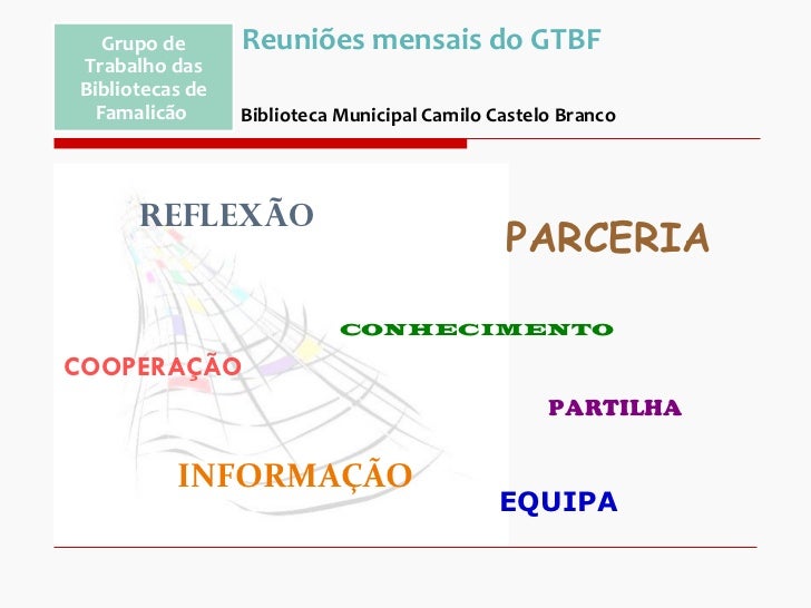 4. 4. Reuniões mensais do GTBF Biblioteca Municipal Camilo Castelo Branco PARCERIA PARTILHA EQUIPA REFLEXÃO COOPERAÇÃO INFORMAÇÃO CONHECIMENTO Grupo de Trabalho das Bibliotecas de Famalicão