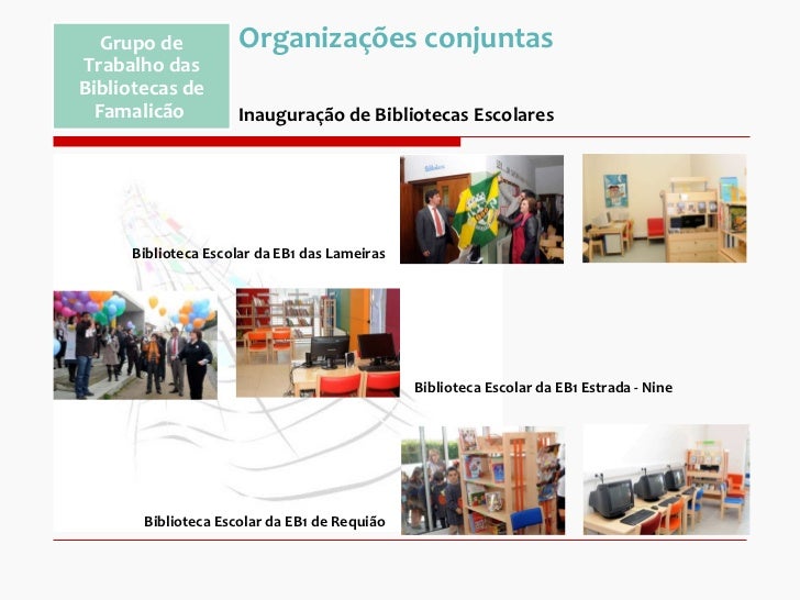 5. 5. Organizações conjuntas <ul><li>Inauguração de Bibliotecas Escolares </li></ul>Biblioteca Escolar da EB1 das Lameiras Biblioteca Escolar da EB1 Estrada - Nine Biblioteca Escolar da EB1 de Requião Grupo de Trabalho das Bibliotecas de Famalicão