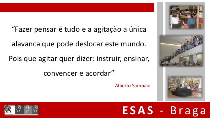 11. 11. “Fazer pensar é tudo e a agitação a únicaalavanca que pode deslocar este mundo.Pois que agitar quer dizer: instruir, ensinar, convencer e acordar” Alberto Sampaio ESAS - Braga