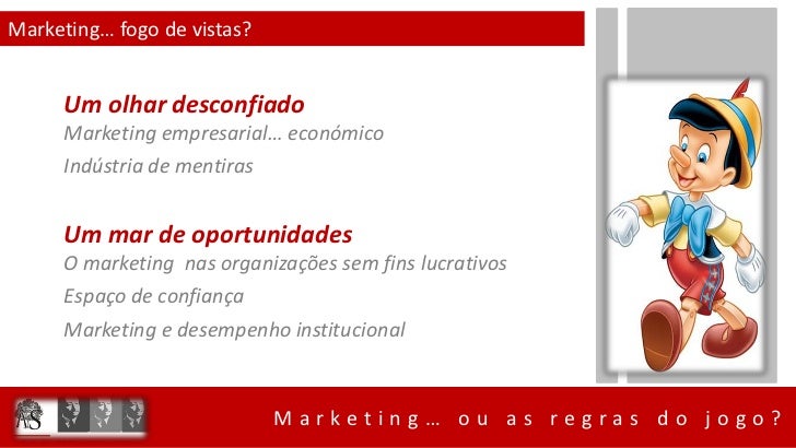 3. 3. Marketing… fogo de vistas? Um olhar desconfiado Marketing empresarial… económico Indústria de mentiras Um mar de oportunidades O marketing nas organizações sem fins lucrativos Espaço de confiança Marketing e desempenho institucional Marketing… ou as regras do jogo?