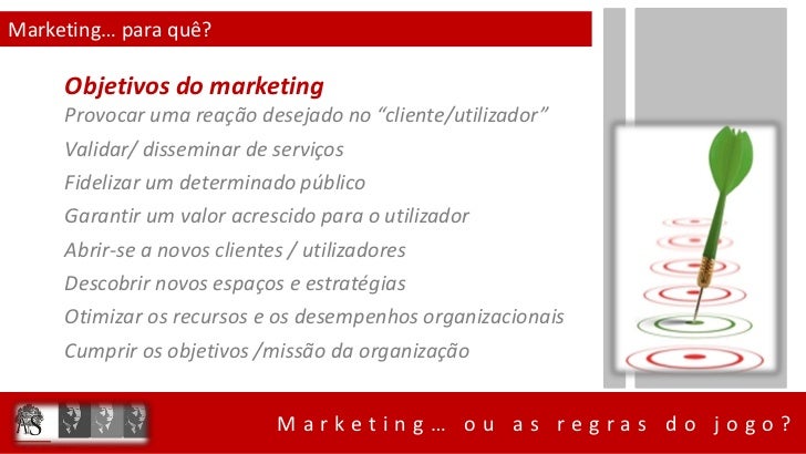 4. 4. Marketing… para quê? Objetivos do marketing Provocar uma reação desejado no “cliente/utilizador” Validar/ disseminar de serviços Fidelizar um determinado público Garantir um valor acrescido para o utilizador Abrir-se a novos clientes / utilizadores Descobrir novos espaços e estratégias Otimizar os recursos e os desempenhos organizacionais Cumprir os objetivos /missão da organização Marketing… ou as regras do jogo?