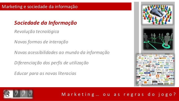 5. 5. Marketing e sociedade da informação Sociedade da Informação Revolução tecnológica Novas formas de interação Novas acessibilidades ao mundo da informação Diferenciação dos perfis de utilização Educar para as novas literacias Marketing… ou as regras do jogo?