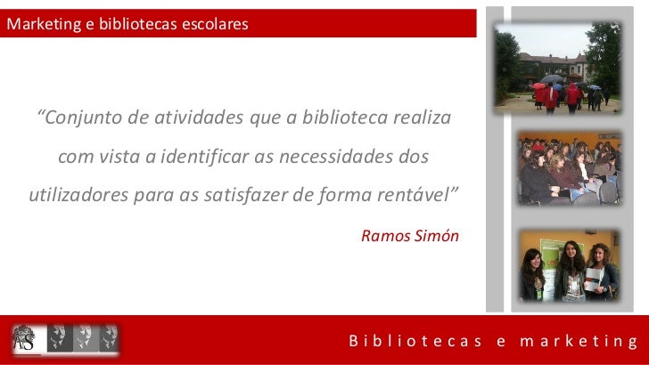 6. 6. Marketing e bibliotecas escolares “Conjunto de atividades que a biblioteca realiza com vista a identificar as necessidades dos utilizadores para as satisfazer de forma rentável” Ramos Simón Bibliotecas e marketing