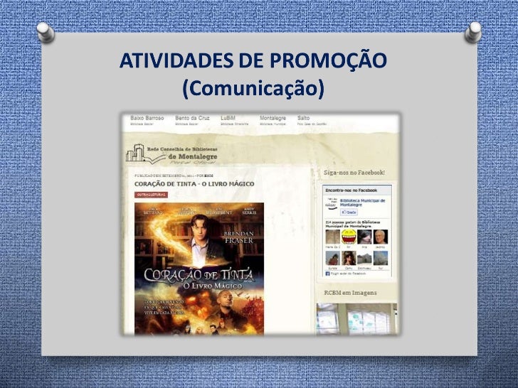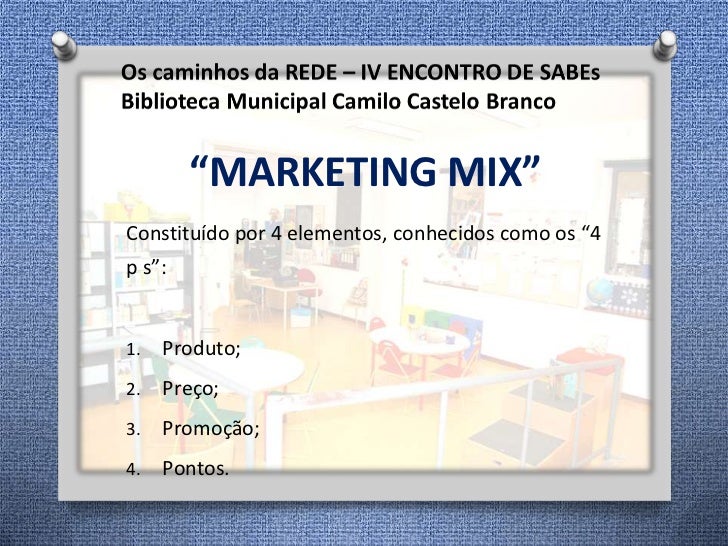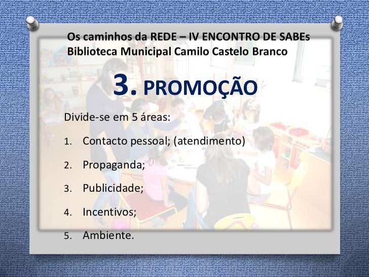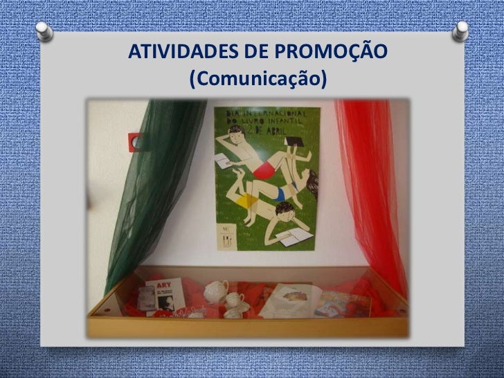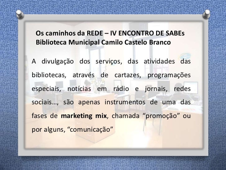 5. 5. A divulgação dos serviços, das atividades dasbibliotecas, através de cartazes, programaçõesespeciais, notícias em rádio e jornais, redessociais…, são apenas instrumentos de uma dasfases de marketing mix, chamada “promoção” oupor alguns, “comunicação”