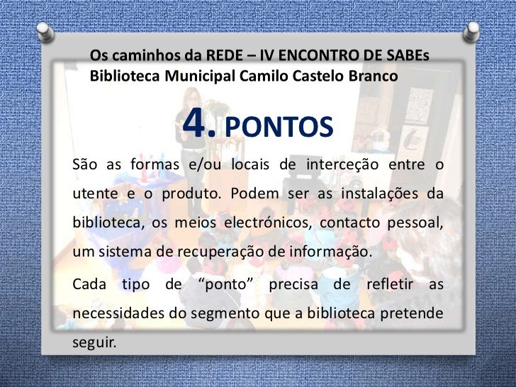 11. 11. 4. PONTOSSão as formas e/ou locais de interceção entre outente e o produto. Podem ser as instalações dabiblioteca, os meios electrónicos, contacto pessoal,um sistema de recuperação de informação.Cada tipo de “ponto” precisa de refletir asnecessidades do segmento que a biblioteca pretendeseguir.
