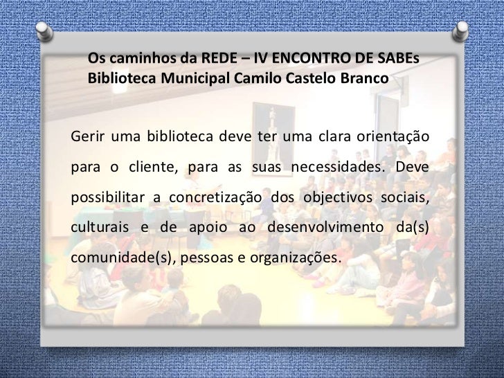 12. 12. Gerir uma biblioteca deve ter uma clara orientaçãopara o cliente, para as suas necessidades. Devepossibilitar a concretização dos objectivos sociais,culturais e de apoio ao desenvolvimento da(s)comunidade(s), pessoas e organizações.